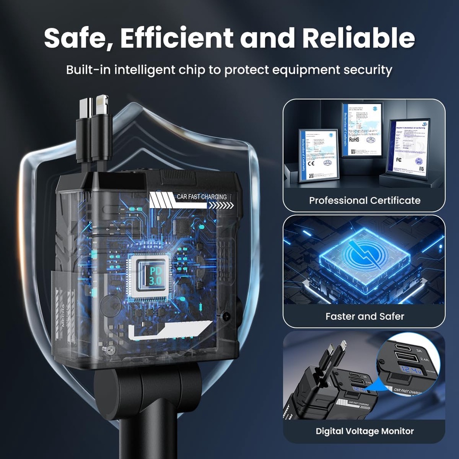 محتاج تشحن موبايلك وأنت سايق؟ أو أكتر من جهاز في نفس الوقت؟ مع شاحن السيارة 4 في 1 القابل للسحب، هتقدر تشحن 4 أجهزة في نفس الوقت بسرعة وكفاءة، سواء كان موبايلك iPhone، سامسونج، جوجل بيكسل، أو حتى اللابتوب والتابلت!